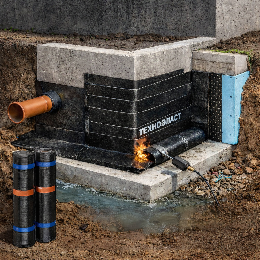 В подземных конструкциях применяется Техноэласт ЭПП на прочной полиэстеровой основе. Материал обладает высокой прочностью на разрыв и устойчив к деформациям, что критично при осадке здания и подвижках грунта.